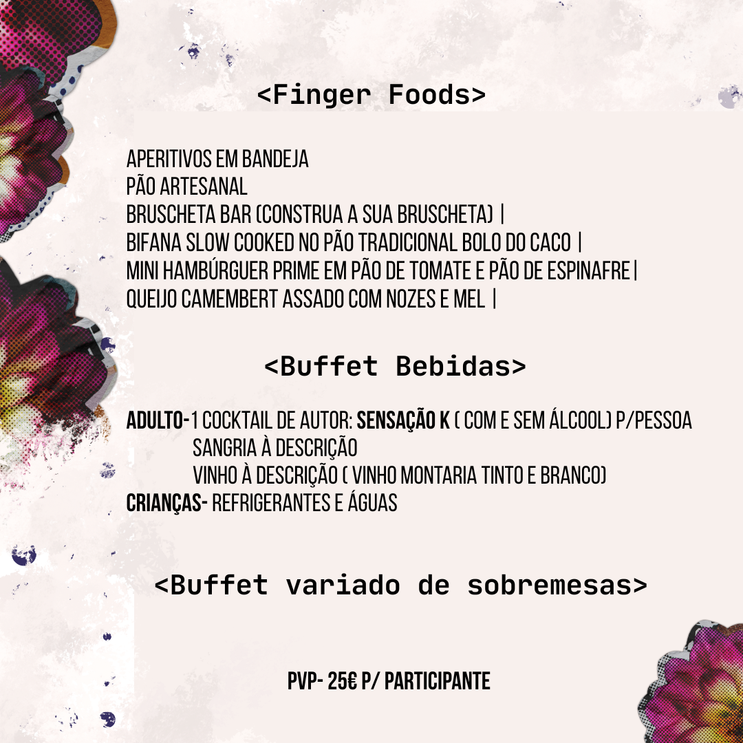 PVP: 25 € por pessoa | O preço inclui acesso livre ao buffet de finger foods, sobremesas e buffet de bebidas ( conforme descrição)